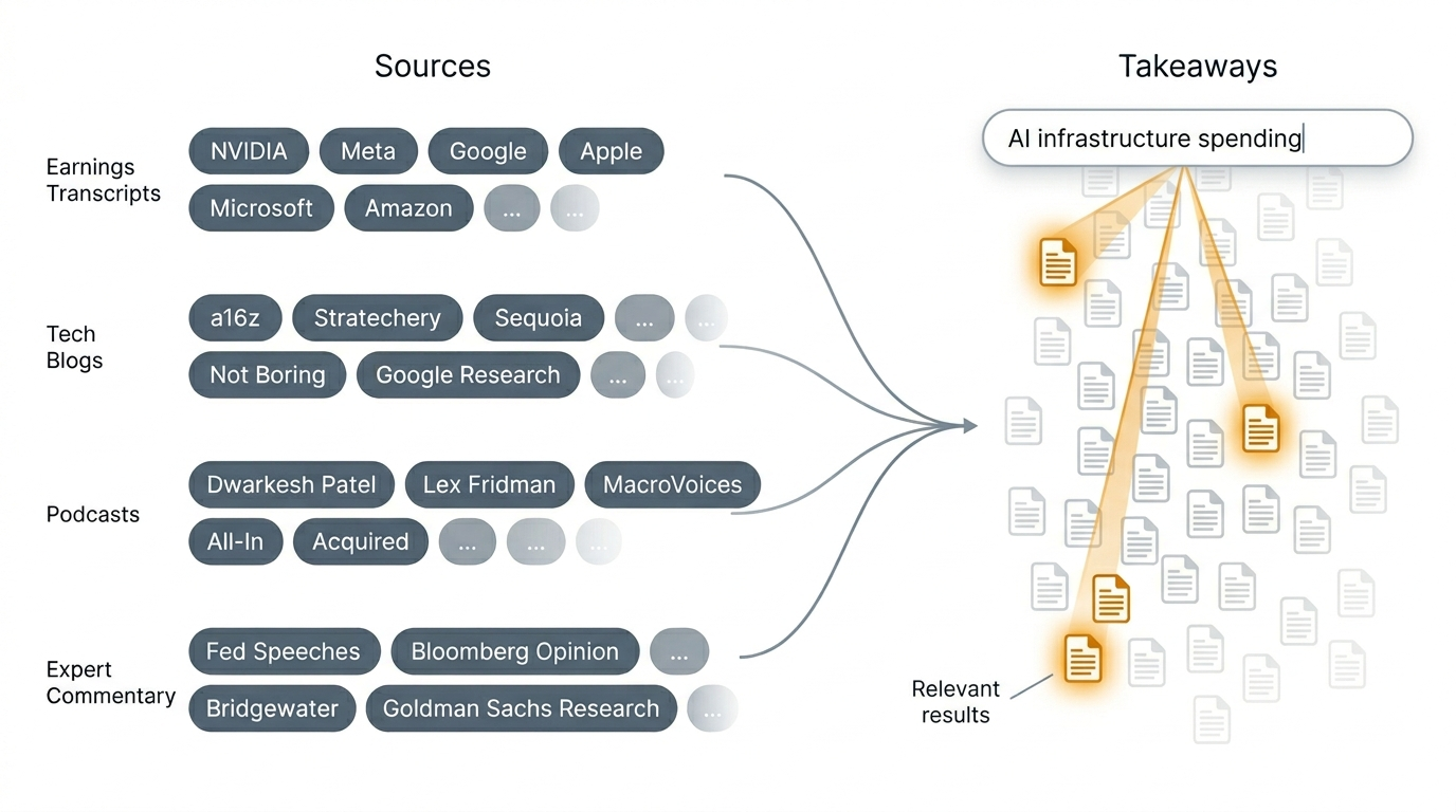 Every earnings call, blog, and podcast, indexed by insight, not by keyword.
